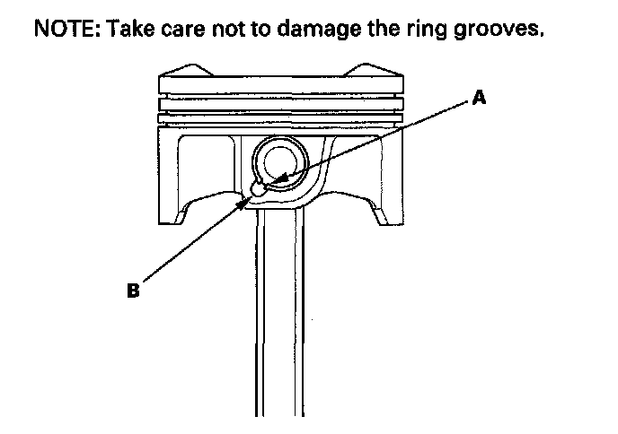 2. Apply new engine oil to the piston pin snap rings (A), and turn them in the ring grooves until the end gaps are lined up with the cutouts in the piston pin bores (B).