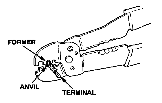 4. Position the terminal in the crimping tool slot with the solid portion of the terminal toward the anvil and the open section toward the former.