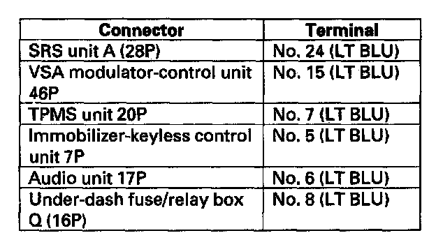 NO - Repair short in the wire between the DLC (K-line) and the VSA modulator-control unit, the SRS unit, the TPMS unit, the immobilizer-keyless control unit, the audio unit, or the under-dash fuse/relay box.