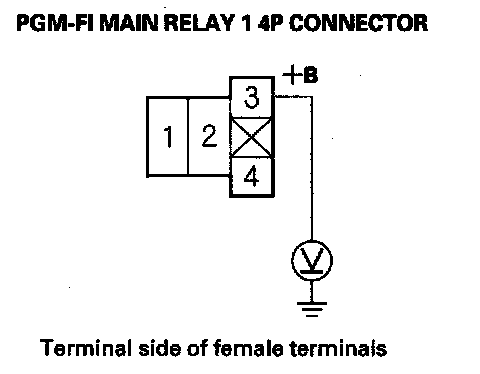 65. Measure voltage between PGM-FI main relay 1 4P connector terminal No. 3 and body ground.