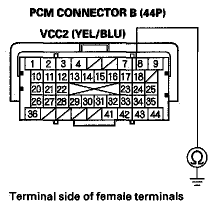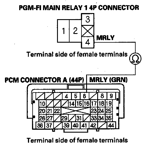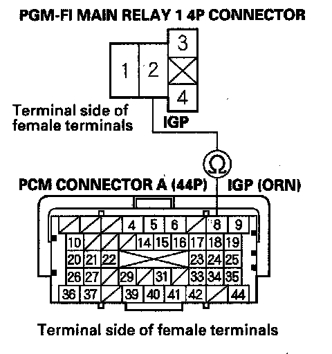 44. Check for continuity between PGM-FI main relay 1 4P connector terminal No. 2 and body ground.