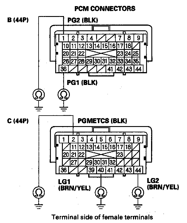73. Check for continuity between body ground and PCM connector terminals B1, B36, C2, C40, and C44 individually.