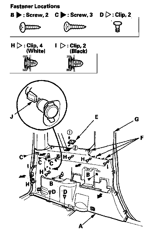 4. Detach the clips (H, I) and pull the panel back to remove it.