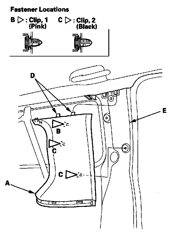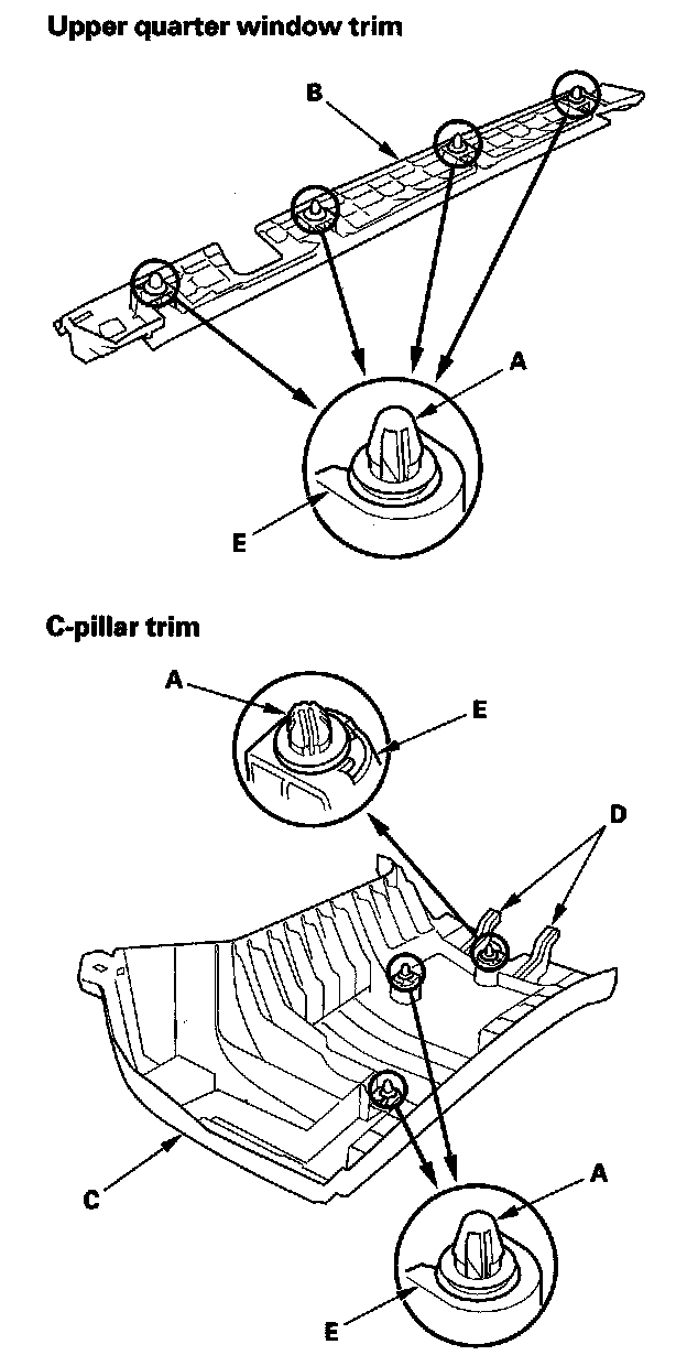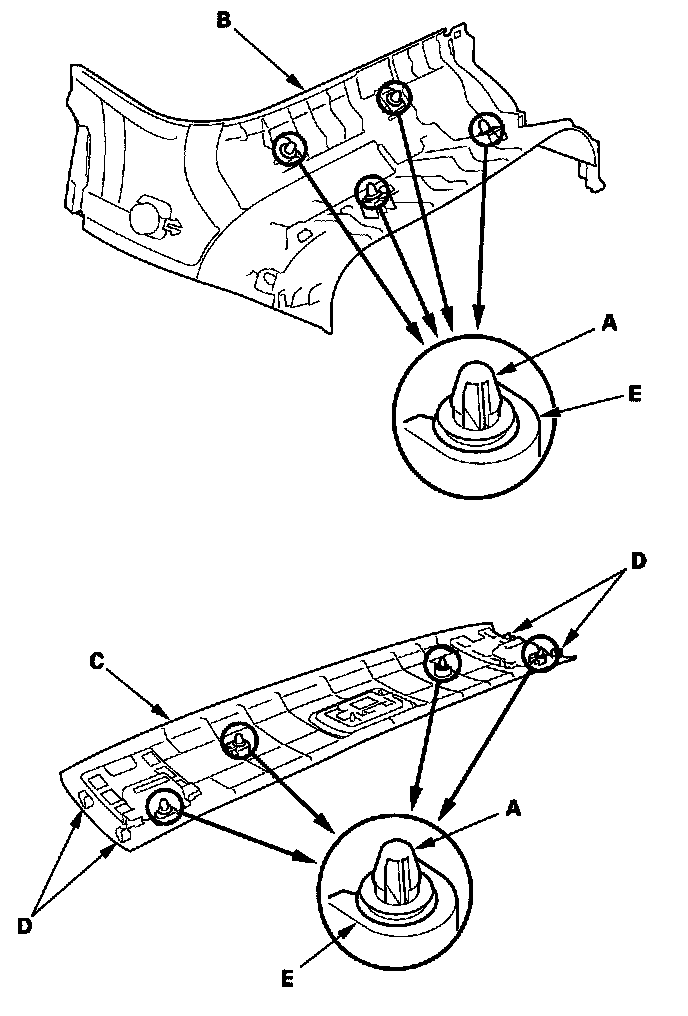 2. Lower the trim to release the upper hooks (D) from the C-Pillar (E)