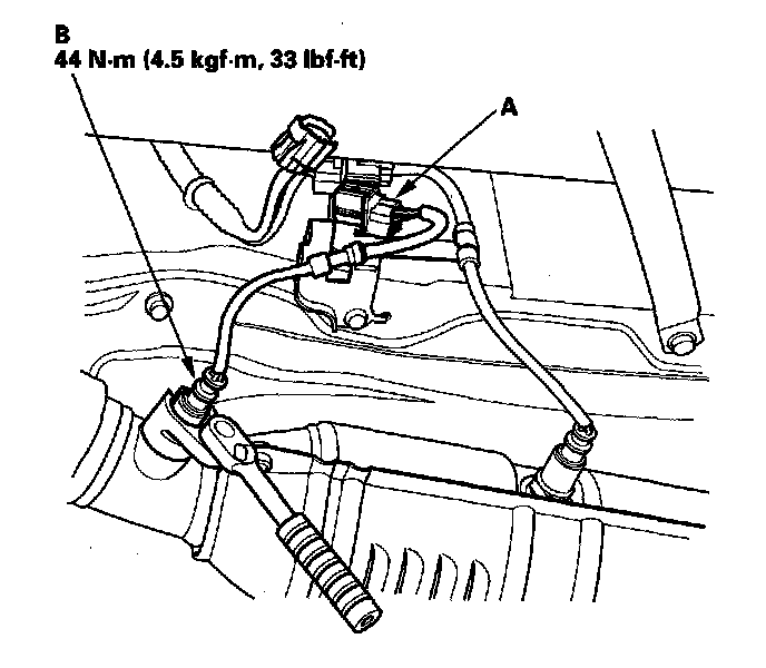 1. Disconnect the A/F sensor 4P connector (A), then remove the A/F sensor (B).