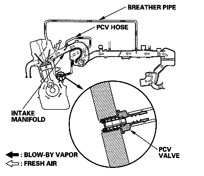 The PCV valve prevents blow-by gasses from escaping into the atmosphere by venting them into the intake manifold.