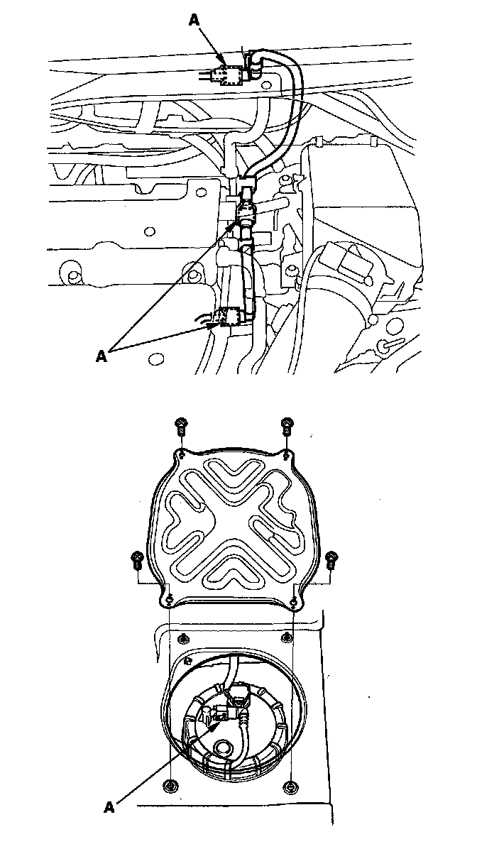 6. Reconnect the negative cable to the battery, and turn the ignition switch ON (II) (but do not operate the starter motor). The fuel pump will run for about 2 seconds, and fuel pressure will rise. Repeat two or three times, and check that there is no leakage in the fuel supply system.
