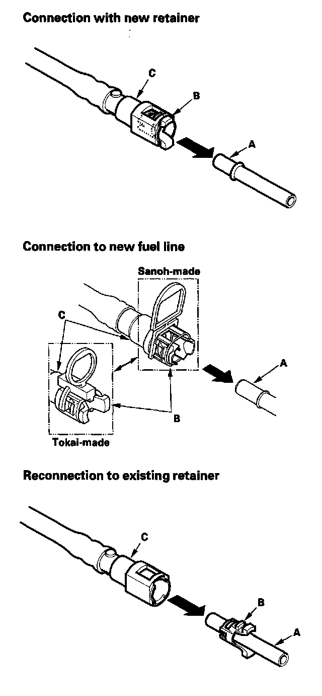 5. When you are reconnecting the connector with the old retainer, make sure the connection is secure and the tabs (A) are firmly locked into place; check visually and also by pulling the connector (B). When you are replacing the fuel line with a new one, make sure you remove the ring pull (C) upwards after you confirm the connection is secure.