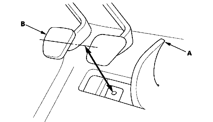 1. Lift up the carpet (A). At the insulator cutout, measure pedal height from the right side of the pedal pad (B).