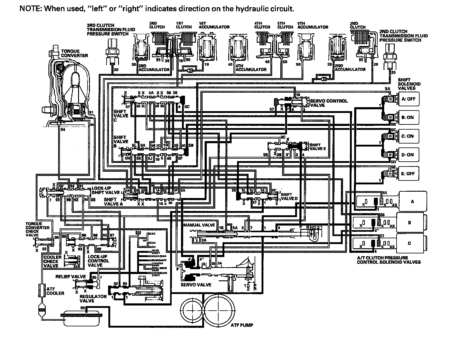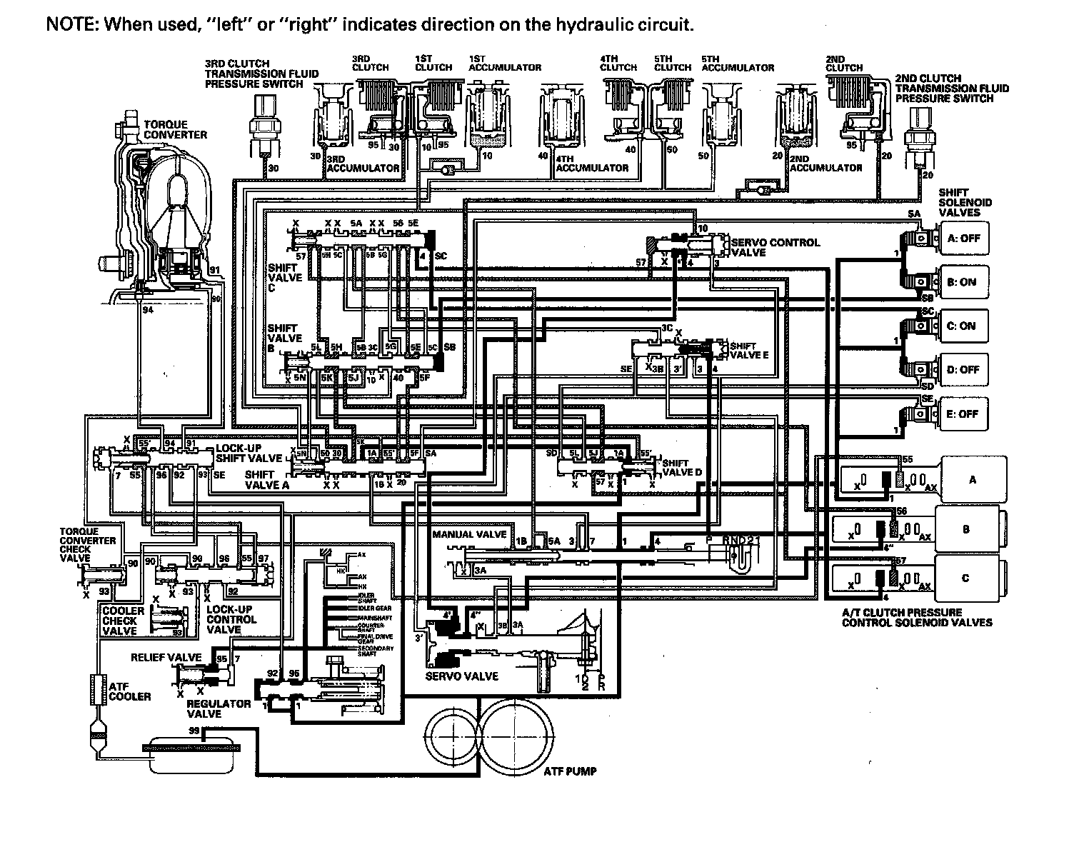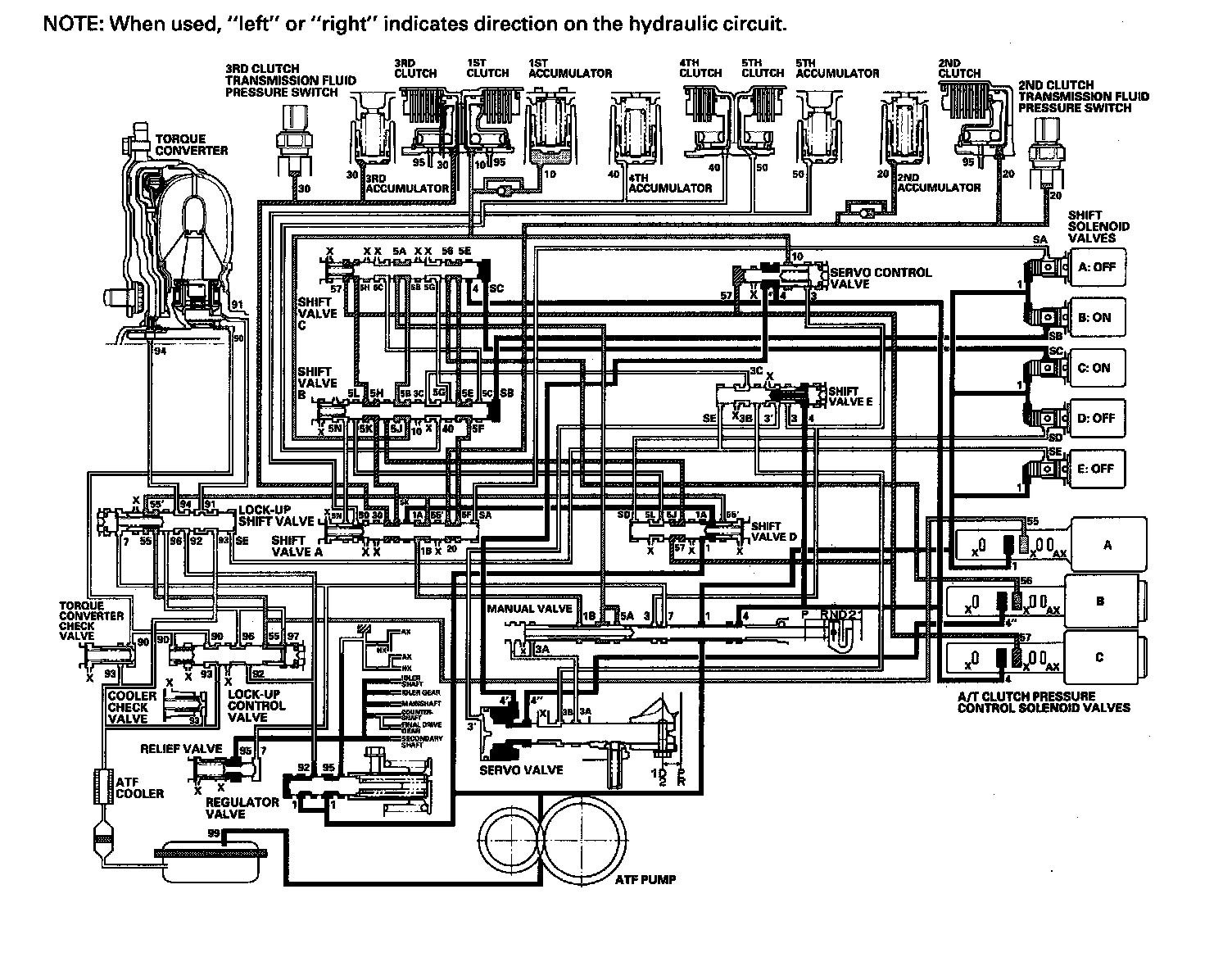 ^ Shift solenoid valve E: OFF, and shift valve E stays on the left side