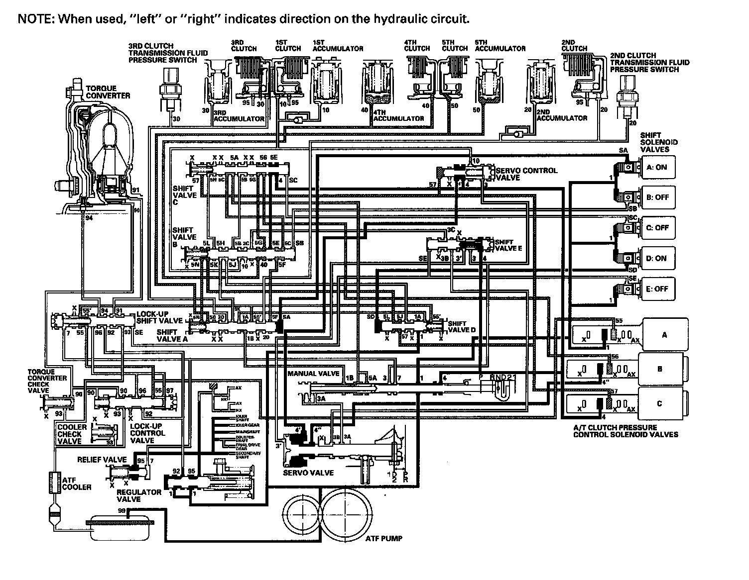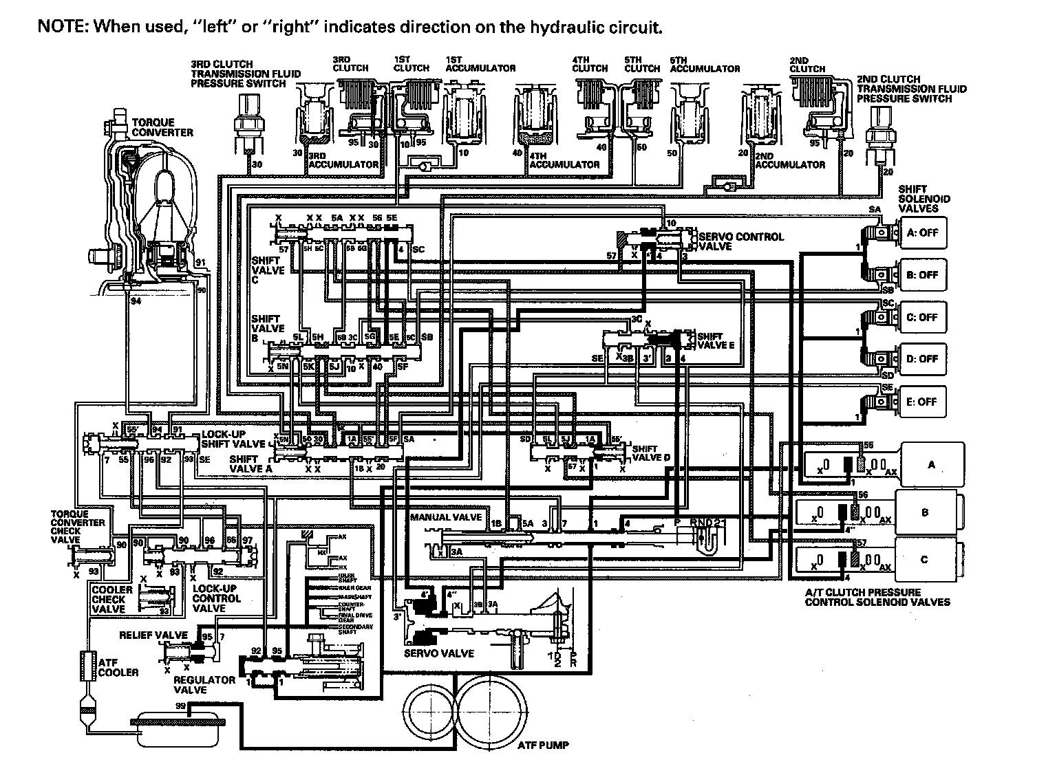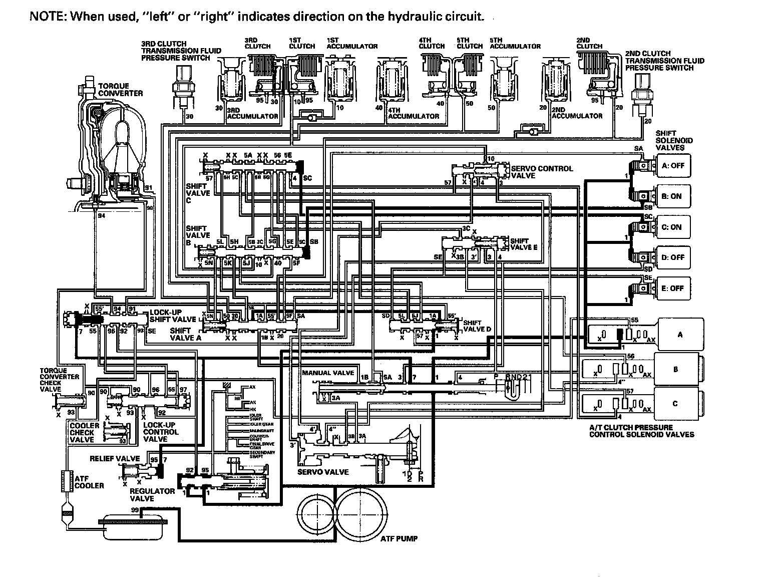 ^ Shift solenoid valve E: OFF, and shift valve E stays on the left side
