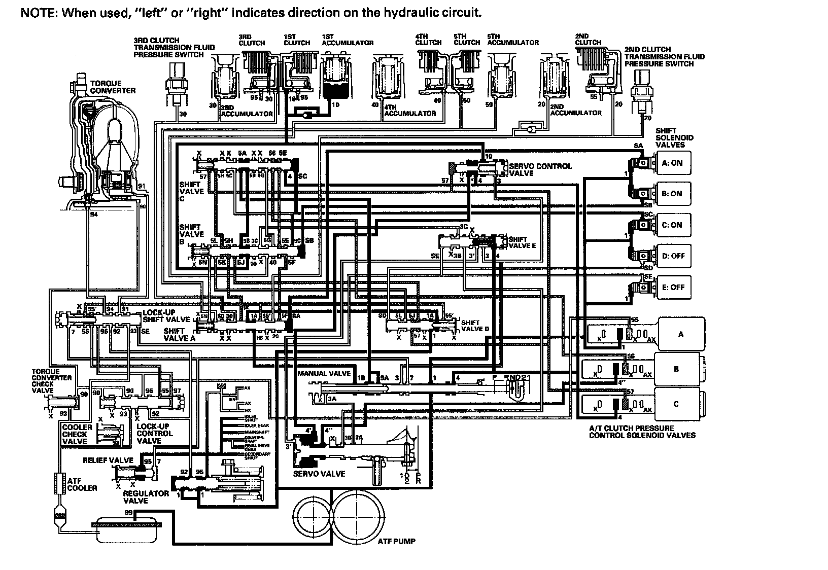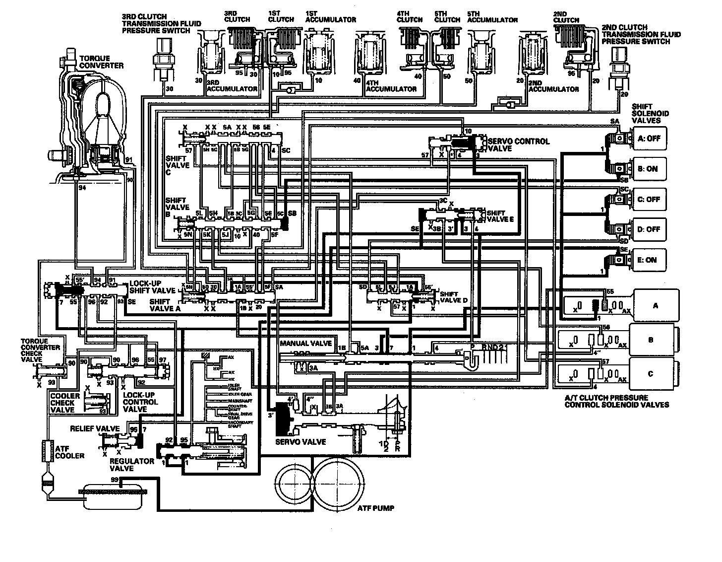 Line pressure (1) - Manual valve-Line pressure (4) - Shift valve C-Line pressure (5E) - Shift valve B-Line pressure (5F) - Shift valve A-2nd clutch pressure (20) - 2nd clutch