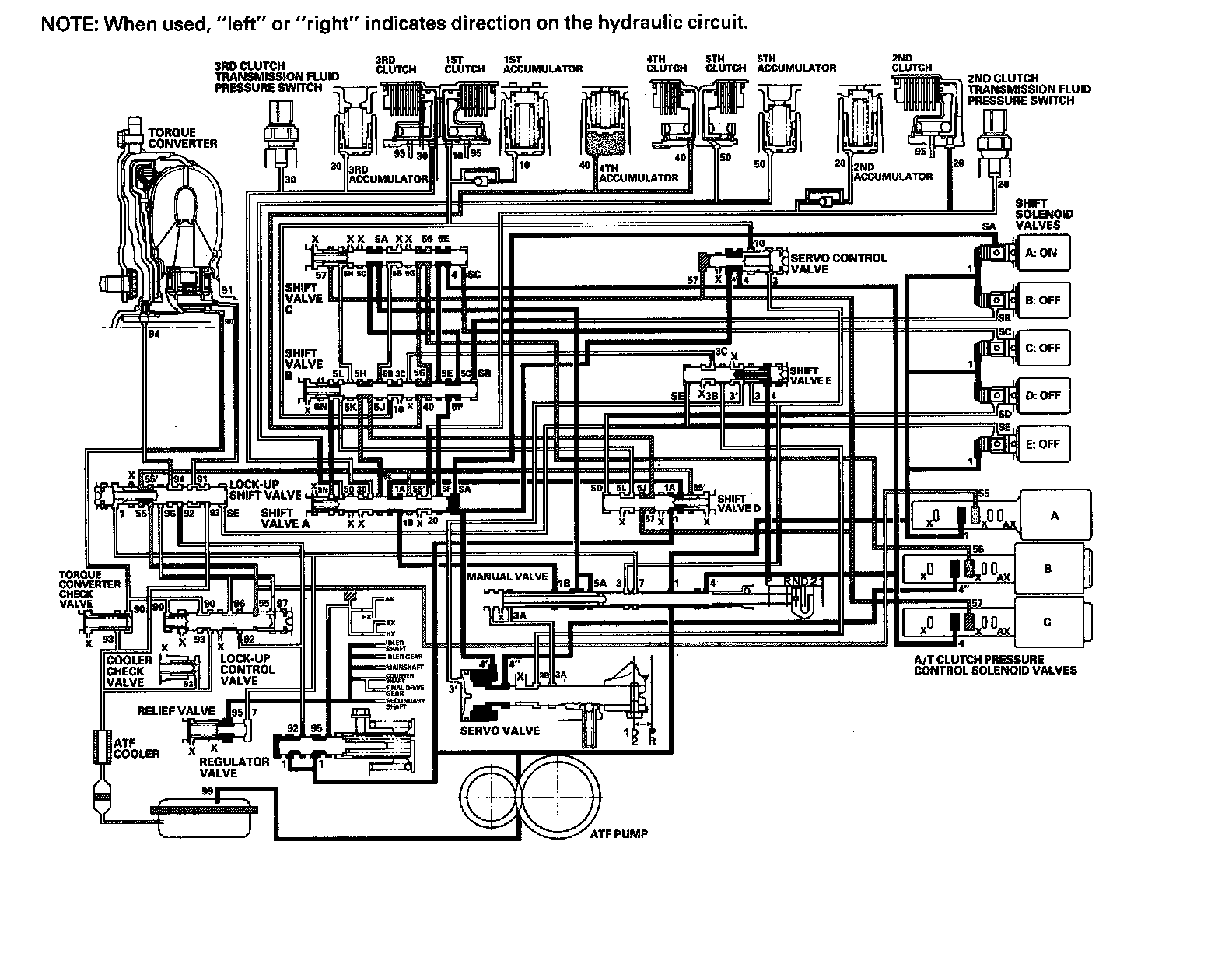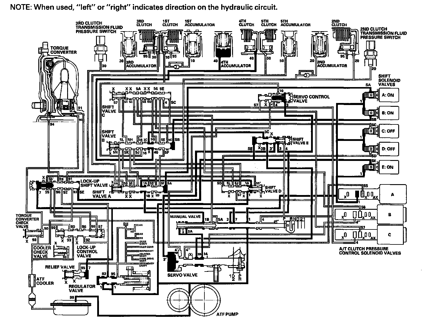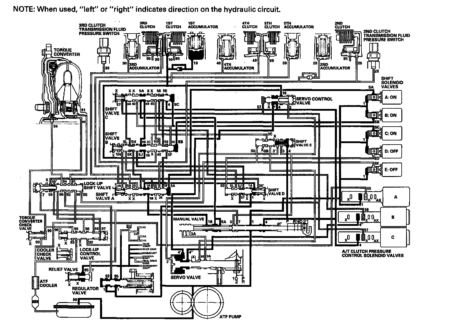While the vehicle is moving forward, the PCM keeps shift solenoid valve E remaining OFF. Shift valve E covers the port of line pressure (3') leading to the servo valve reverse position. The servo valve cannot be shifted to reverse position, and hydraulic pressure is not applied to the 4th clutch from servo valve for reverse; as a result, power is not transmitted to the reverse direction.
