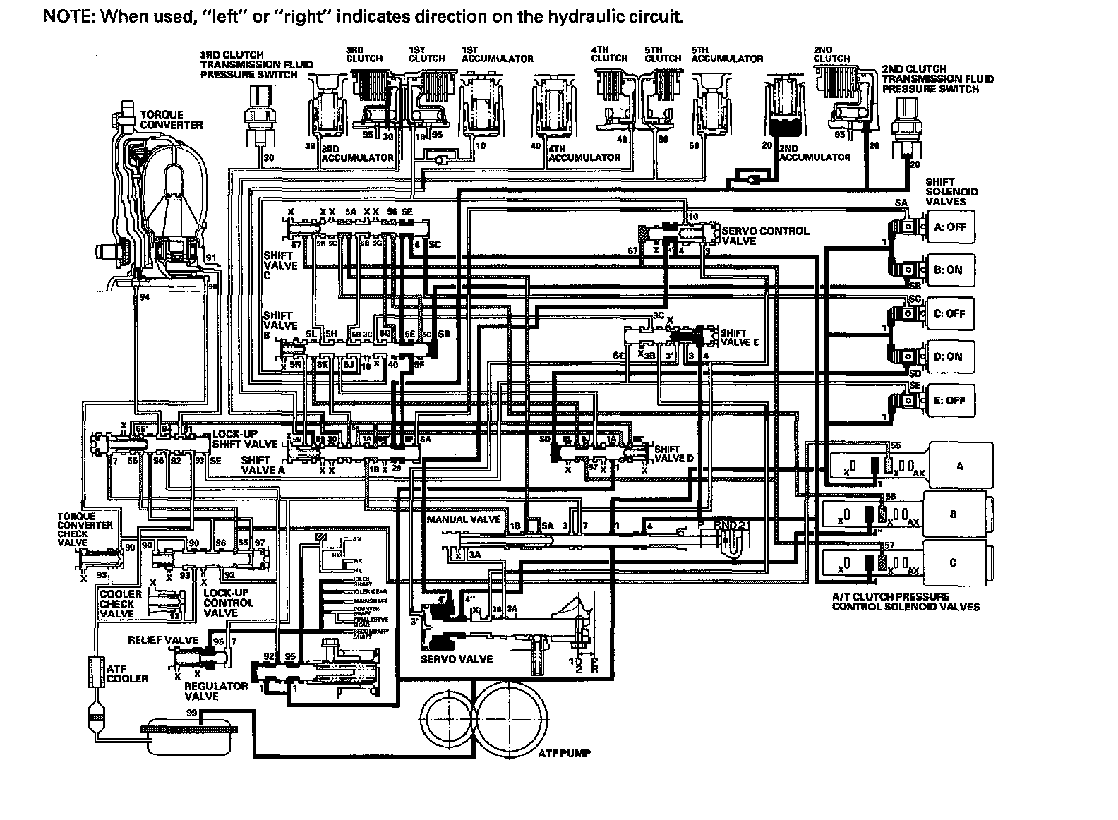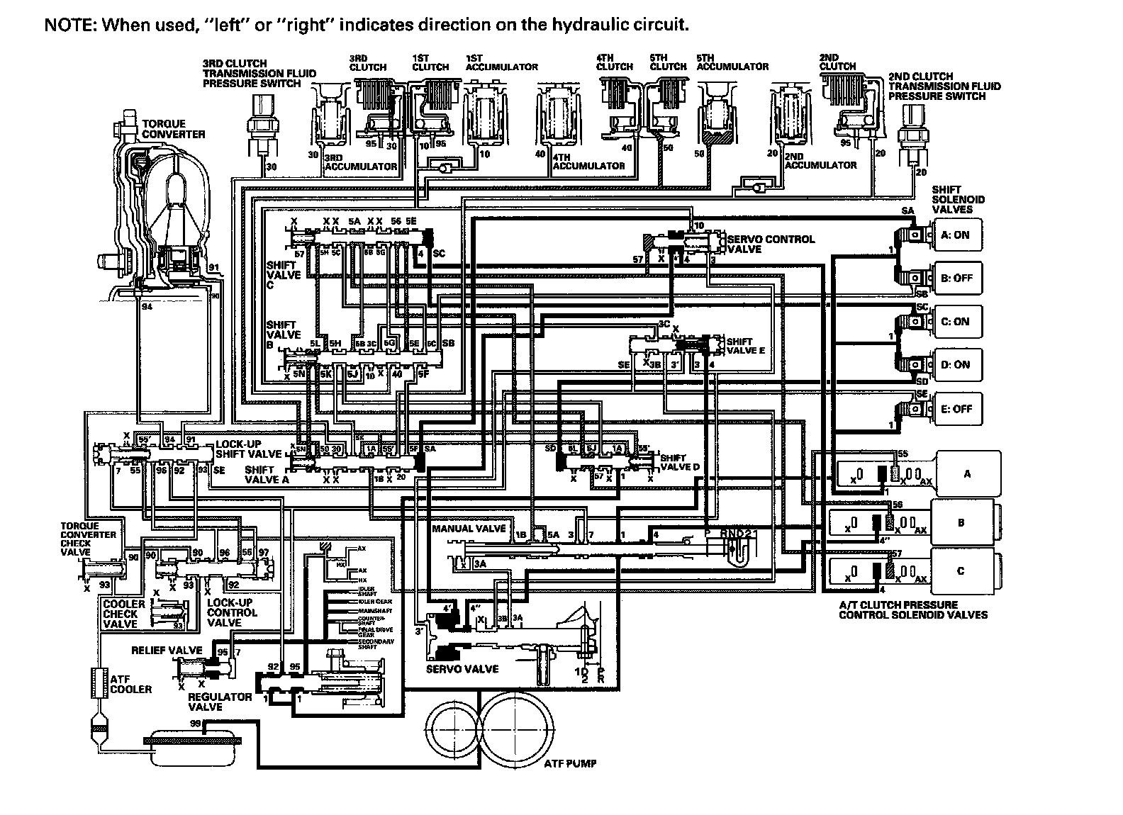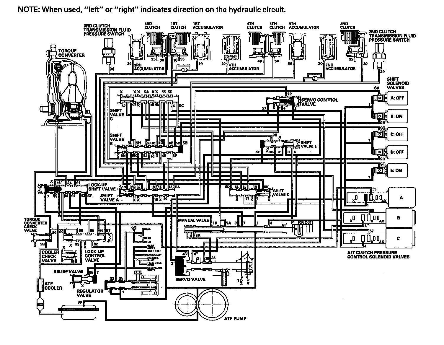 While the vehicle is moving forward, the PCM keeps shift solenoid valve E remaining OFF. Shift valve E covers the port of line pressure (3') leading to the servo valve reverse position. The servo valve cannot be shifted to reverse position, and hydraulic pressure is not applied to the 4th clutch from servo valve for reverse; as a result, power is not transmitted to the reverse direction.