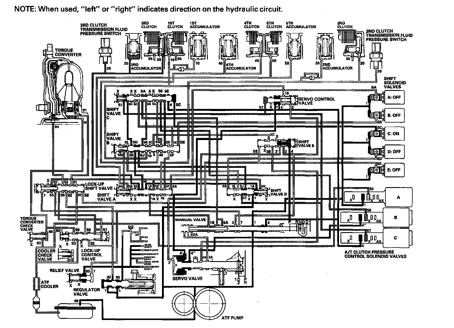 ^ Shift solenoid valve C: OFF, and shift valve C stays on the right side