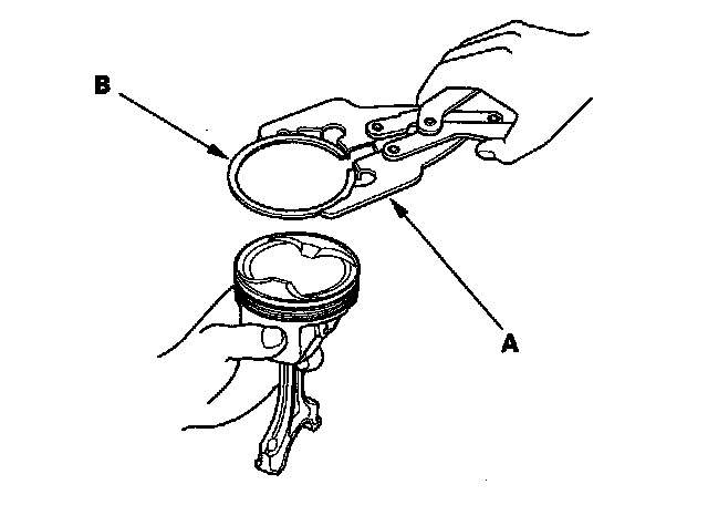 2. Using a ring expander (A), remove the old piston rings (B).