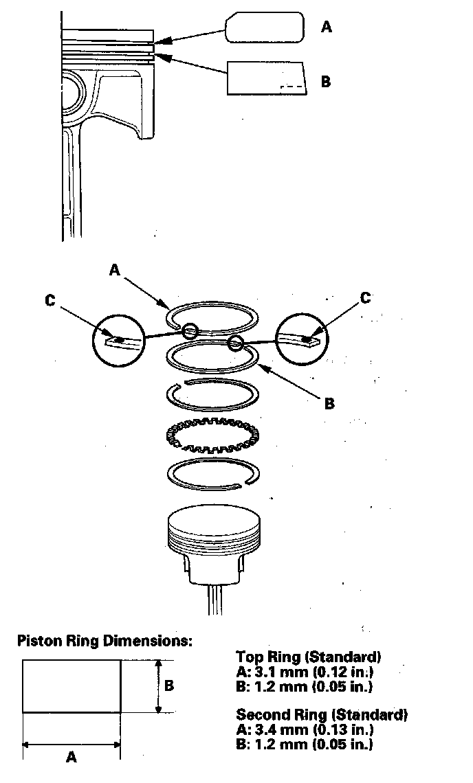 6. Install the top ring and second ring as shown. The top ring (A) has a 1Z mark and the second ring (B) has a 2R mark. The manufacturing marks (C) must be facing upward.