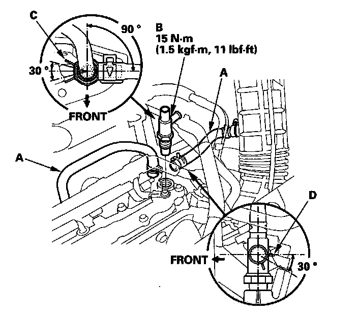 - Position the valve (B) and the clamp (C) angle as shown.