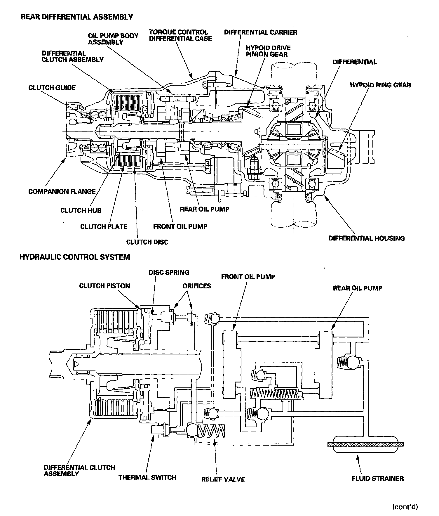 The rear differential assembly consists of the torque control differential case assembly and the rear differential carrier assembly. The torque control differential case assembly consists of the differential clutch assembly, the companion flange, and the oil pump body assembly. The rear differential carrier assembly consists of the differential mechanism. The differential clutch assembly consists of the clutch guide, the clutch hub, the clutch plate, the clutch disc, the return spring, and the pilot clutch.