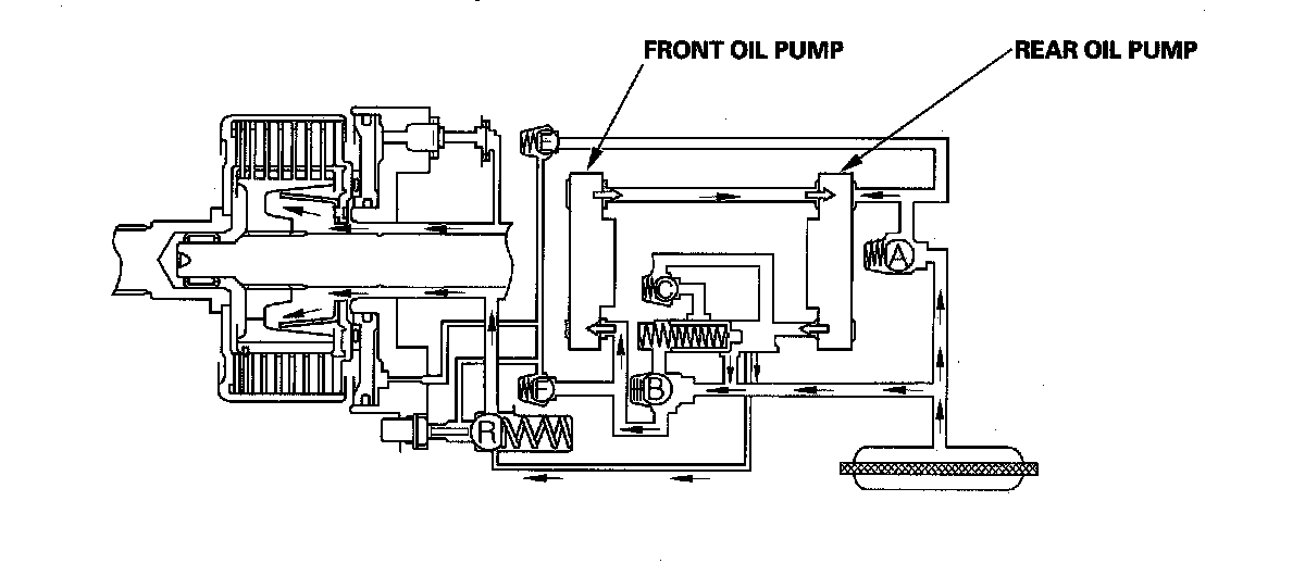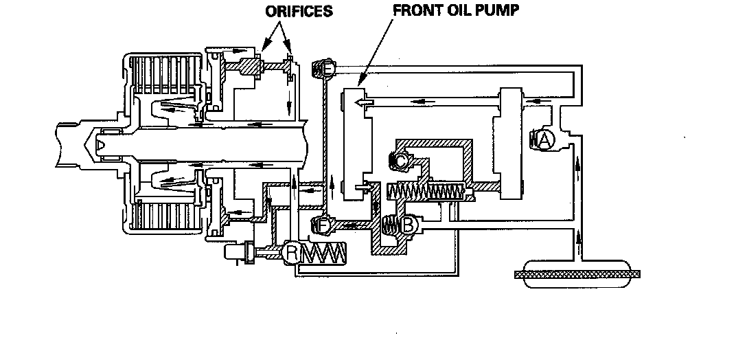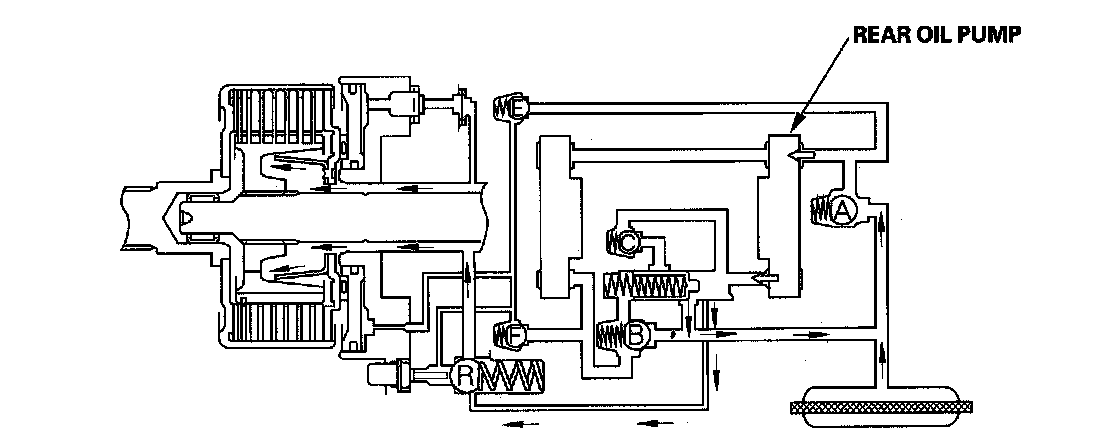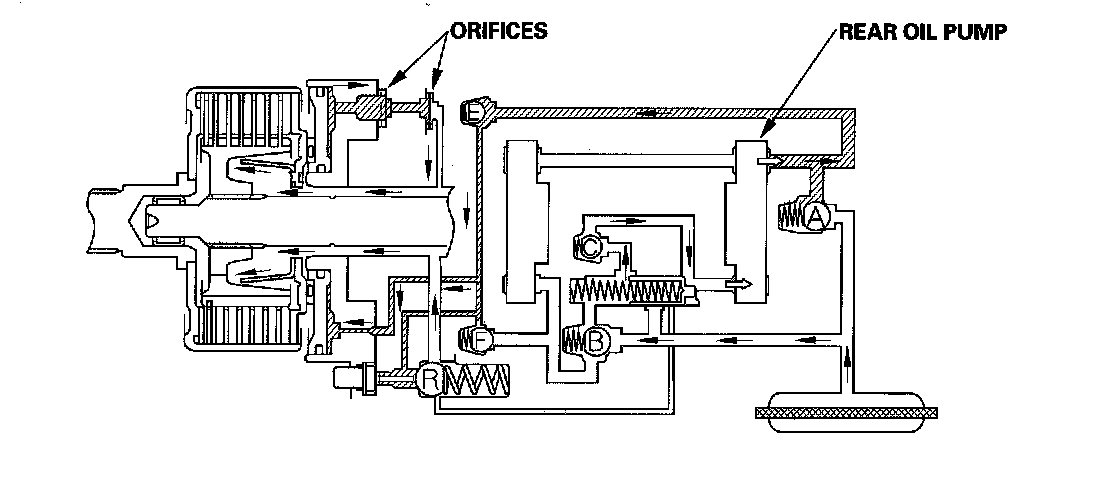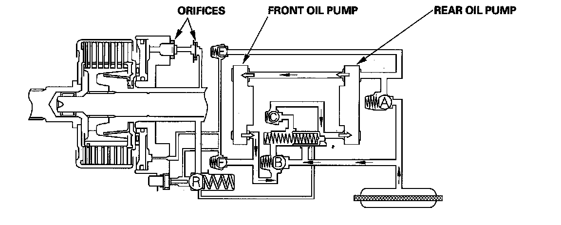Some of the fluid that is discharged by the front oil pump is drawn in by the rear oil pump. The remaining fluid passes through check valve F into the cylinder of the clutch piston, where it is regulated by two orifices.