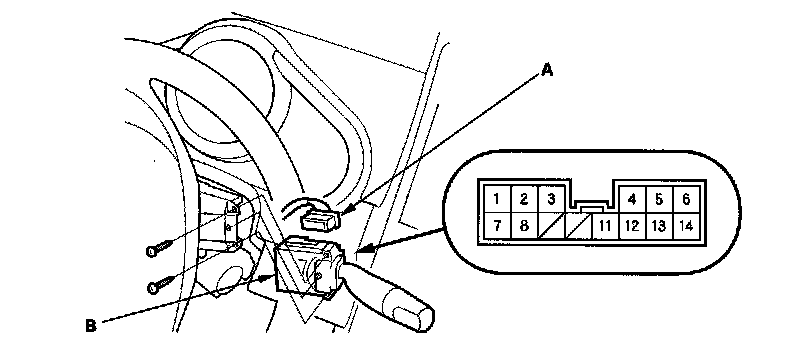 3. Disconnect the 14P connector (A) from the wiper/washer switch (B).