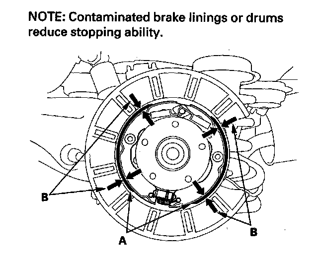 5. Measure the parking brake lining thickness (B). Measurement does not include brake shoe thickness.