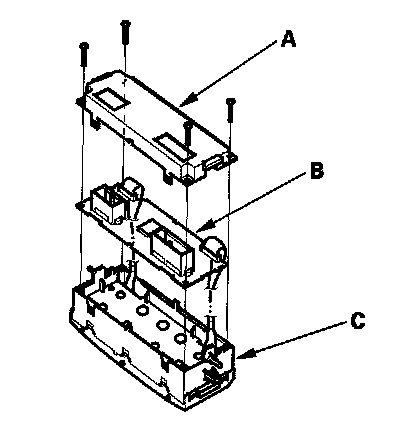 2. Remove the self-tapping screws, then carefully separate the climate control unit cover (A) and the control unit (B) from the control unit display (C). Do not kink or pull on the wires between the display and the control unit. Do not touch the electronic components on the printed circuit board in the control unit.