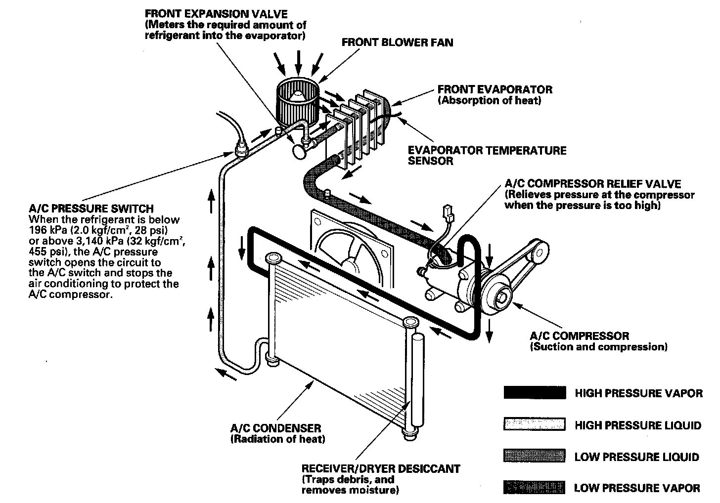 System DescriptionThe air conditioning system removes heat from the passenger compartment by transferring heat from the ambient air to the evaporator. The evaporator cools the air with the refrigerant that is circulating through the evaporator. The refrigerant expands in the evaporator, and the evaporator becomes very cold and absorbs the heat from the ambient air. The blower fan pushes air across the evaporator where the heat is absorbed, and then it blows the cool air into the passenger compartment.