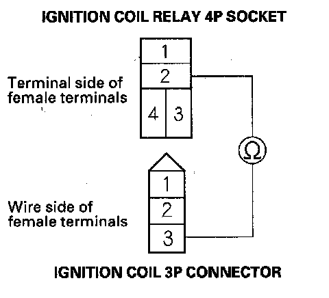 4. Check for continuity between ignition coil relay 4P socket terminal No. 2 and the each ignition coil 3P connector terminal No. 3.