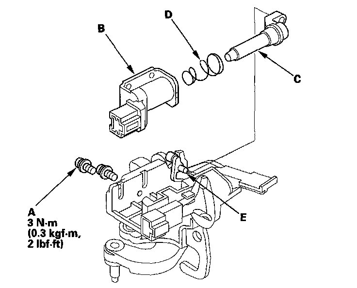 5. Apply silicone grease to the tip (E) of the shift lock extension, and install the shift lock solenoid by aligning the joint of the shift lock solenoid plunger with the tip of the shift lock extension.