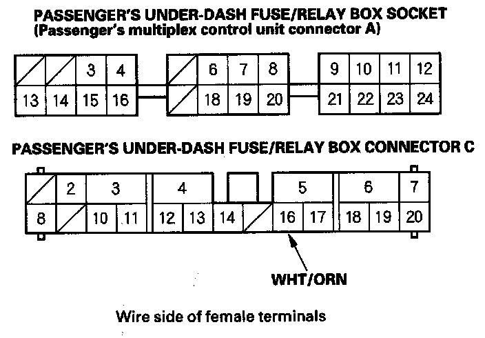 4. With the passenger's multiplex control unit still disconnected, make these input tests at the passenger's under-dash fuse/relay box socket.