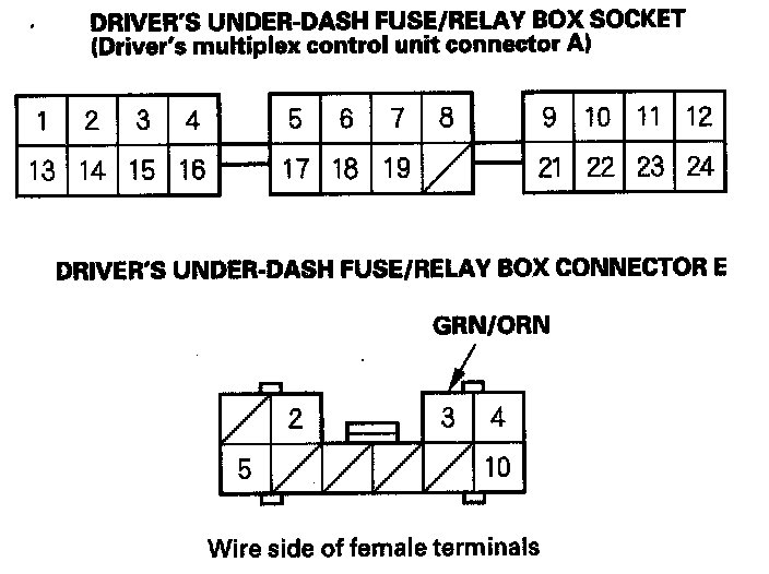 8. With the driver's multiplex control unit still disconnected, make these input tests at the driver's under-dash fuse/relay box socket.
