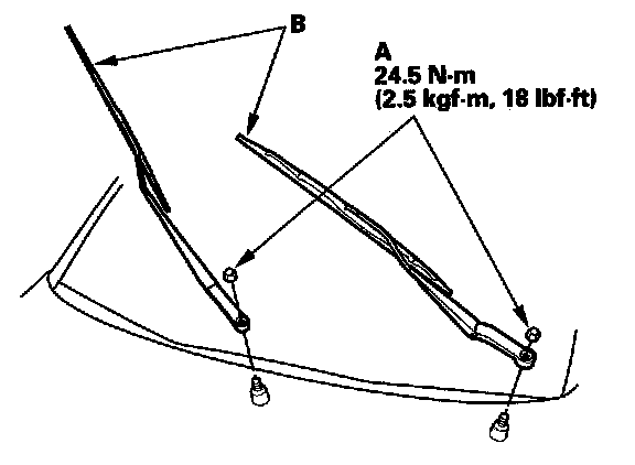 1. Remove the nuts (A) and the windshield wiper arms (B).