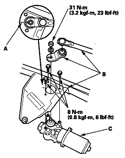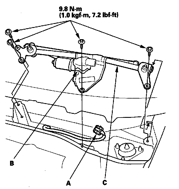 4. Remove the mounting bolts and the wiper linkage assembly (C).