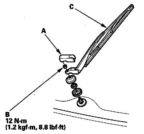1. Remove the cover (A), mounting nut (B) and rear window wiper arm (C).