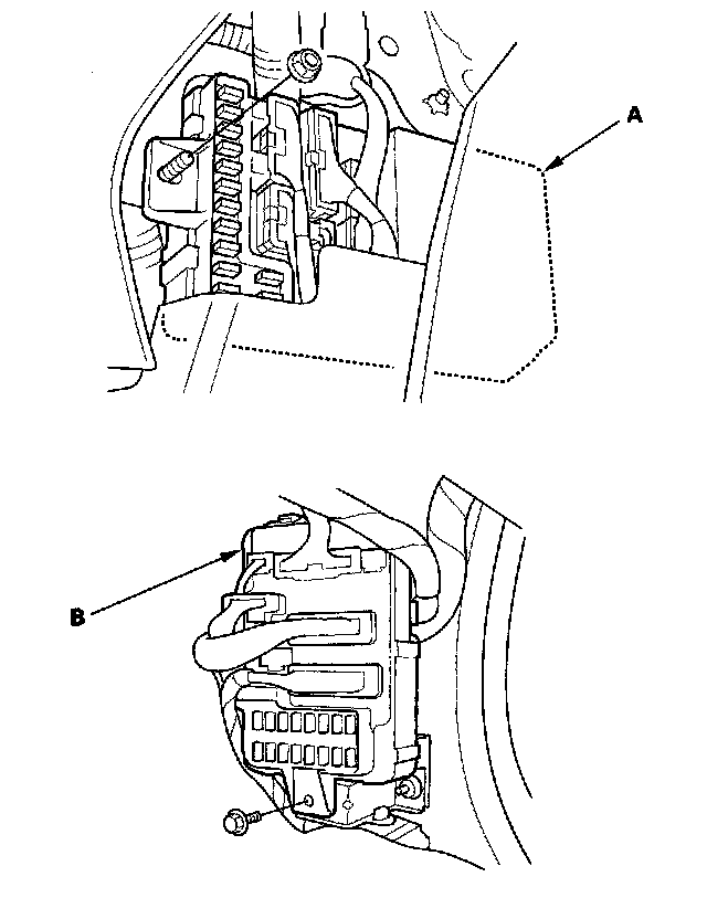 4. Remove the mounting nut or bolt, and pull the driver's under-dash fuse/relay box (A) or passenger's under-dash fuse/relay box (B) away from the body.