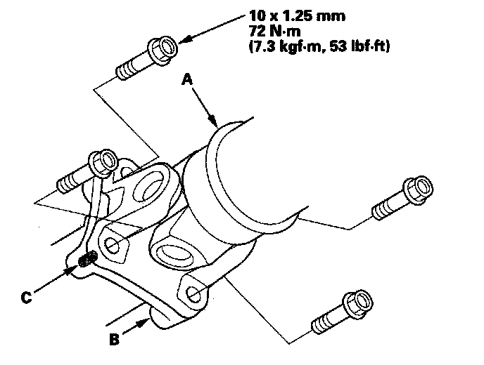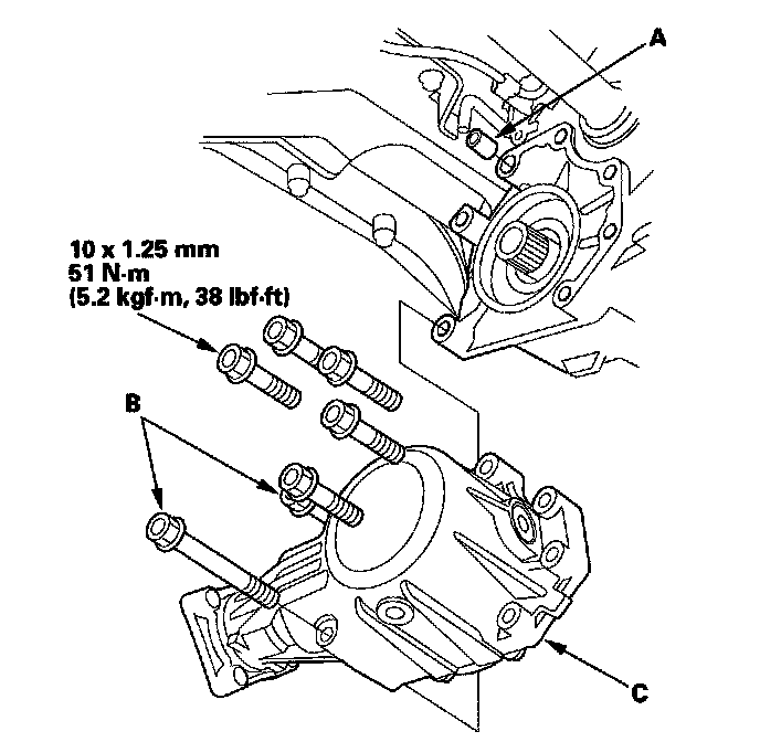 3. Insert the two 10 x 1.25 mm bolts (length: 105 mm) (B) in the rear upper of the transfer housing, then install the transfer assembly (C) on the transmission.
