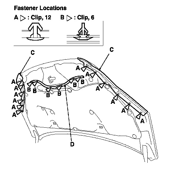 1. Using a clip remover, detach the clips (A, B), then remove the hood seals (C, D). Take care not to scratch the hood.