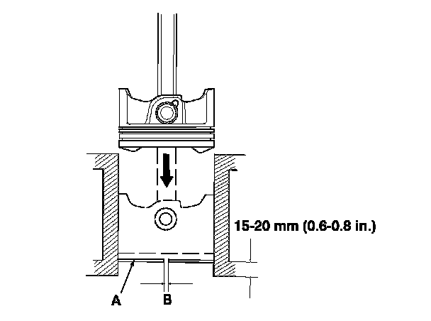 4. Using a piston that has its rings removed, push a new ring (A) into the cylinder bore 15-20 mm (0.6-0.8 in.) from the bottom.