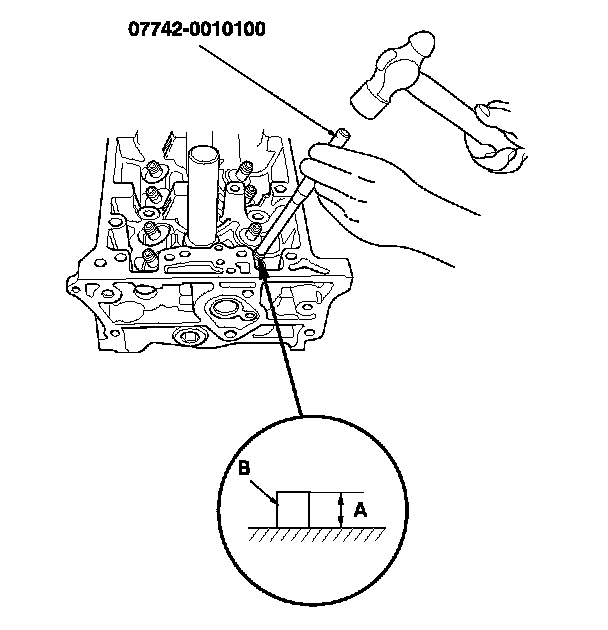 9. Apply a thin coat of clean engine oil to the outside of the new valve guide. Install the guide from the camshaft side of the head; use the 5.5 mm valve guide driver to drive the guide in to the specified installed height (A) of the guide (B). If you have all 16 guides to do, you may have to reheat the head.