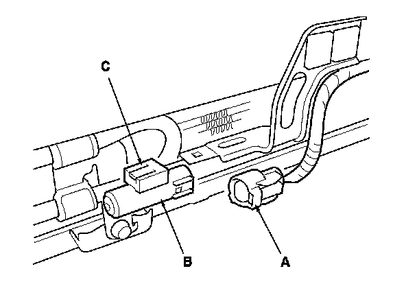 2. Lift the tab (C) to release the lock, then remove the outside air temperature sensor from the front bumper.