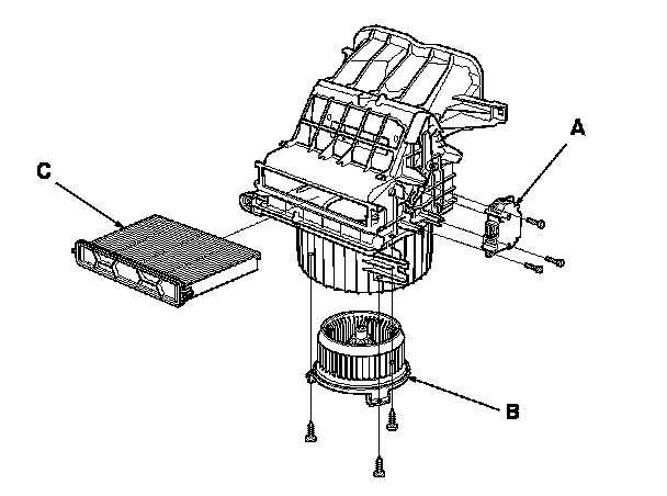 - The recirculation control motor (A), blower motor (B), and the dust and pollen filter (C) can be replaced without removing the blower unit.