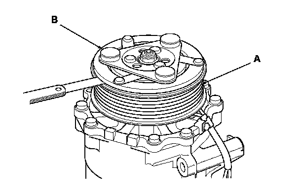 3. Measure the clearance between the rotor pulley (A) and the armature plate (B) all the way around. If the clearance is not within specified limits, remove the armature plate Service and Repair and add or remove shims as needed to increase or decrease clearance.