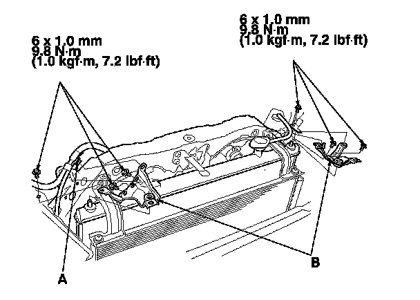 5. Remove the bolts, the harness clip (A), and the radiator upper mount brackets (B).