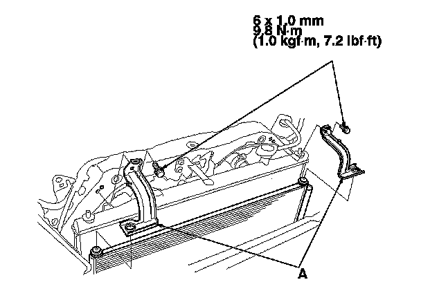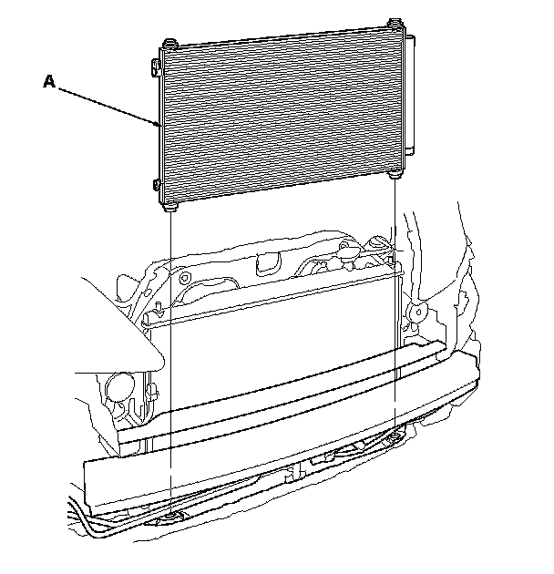 8. Remove the A/C condenser (A) by lifting it up. Be careful not to damage the radiator and A/C condenser fins when removing the A/C condenser.