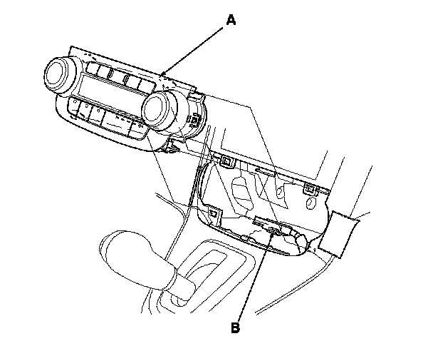 4. Remove the climate control unit (A). Disconnect the connector (B).