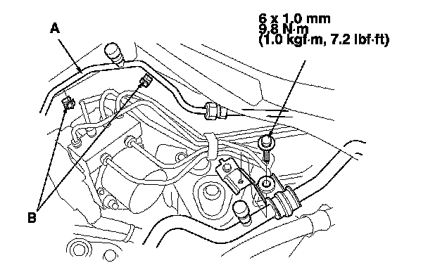 2. Remove the bolt from the A/C line clamp, and remove the receiver line (A) from the clips (B).