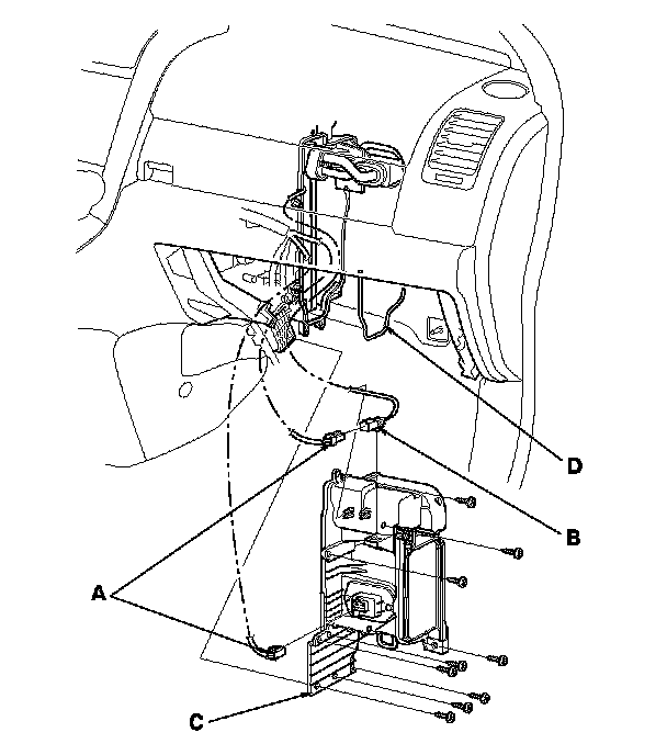 6. Disconnect the connectors (A) from the evaporator temperature sensor and the power transistor, then remove the connector clip (B). Remove the self-tapping screws, the expansion valve cover (C), and the seal (D).