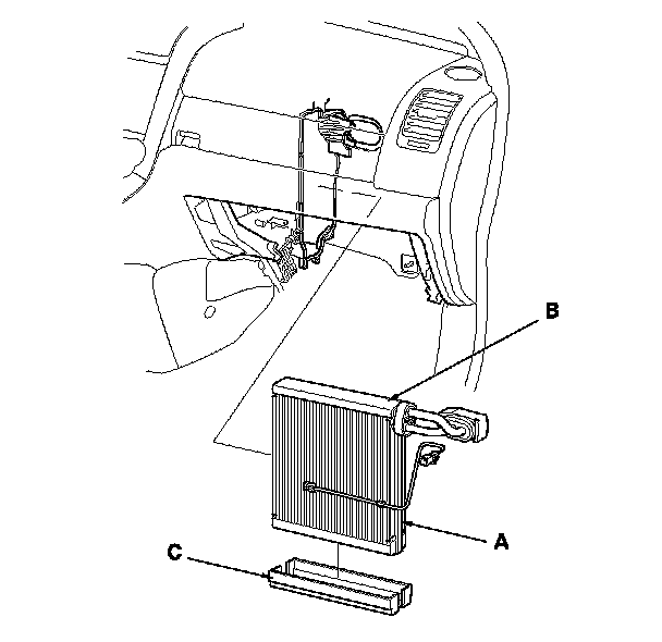 7. Carefully pull out the evaporator core (A) without bending the lines or damaging the EPT sealer (B), then remove the plate (C).