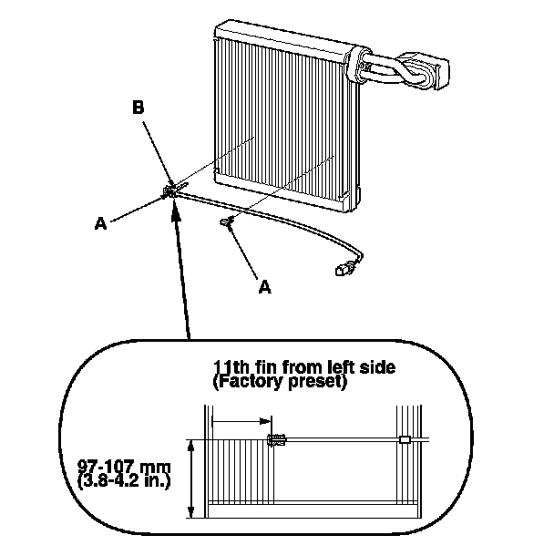9. When the evaporator temperature sensor (A) is reinstalled, set the evaporator temperature sensor in the 12th row of fins from the left side.